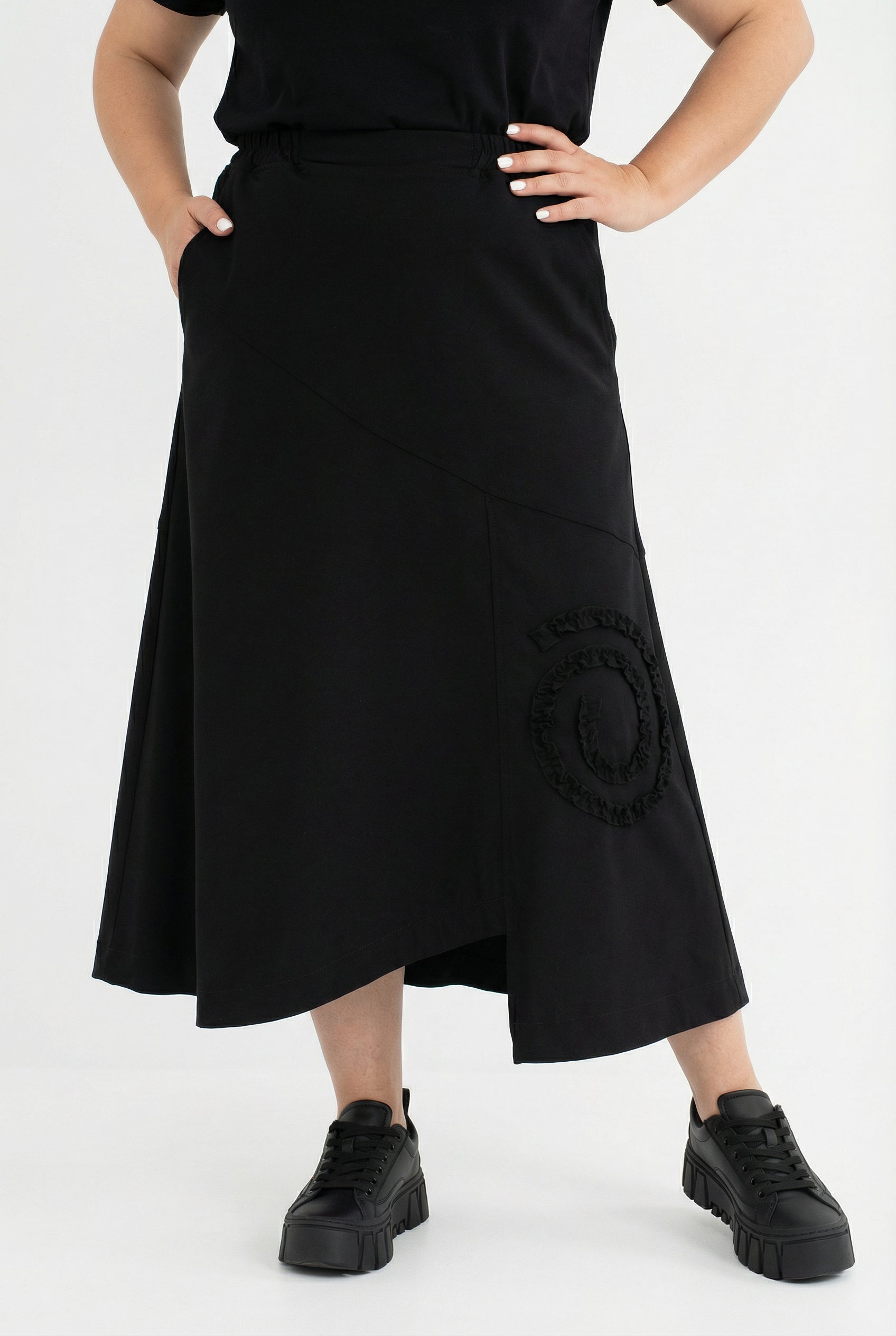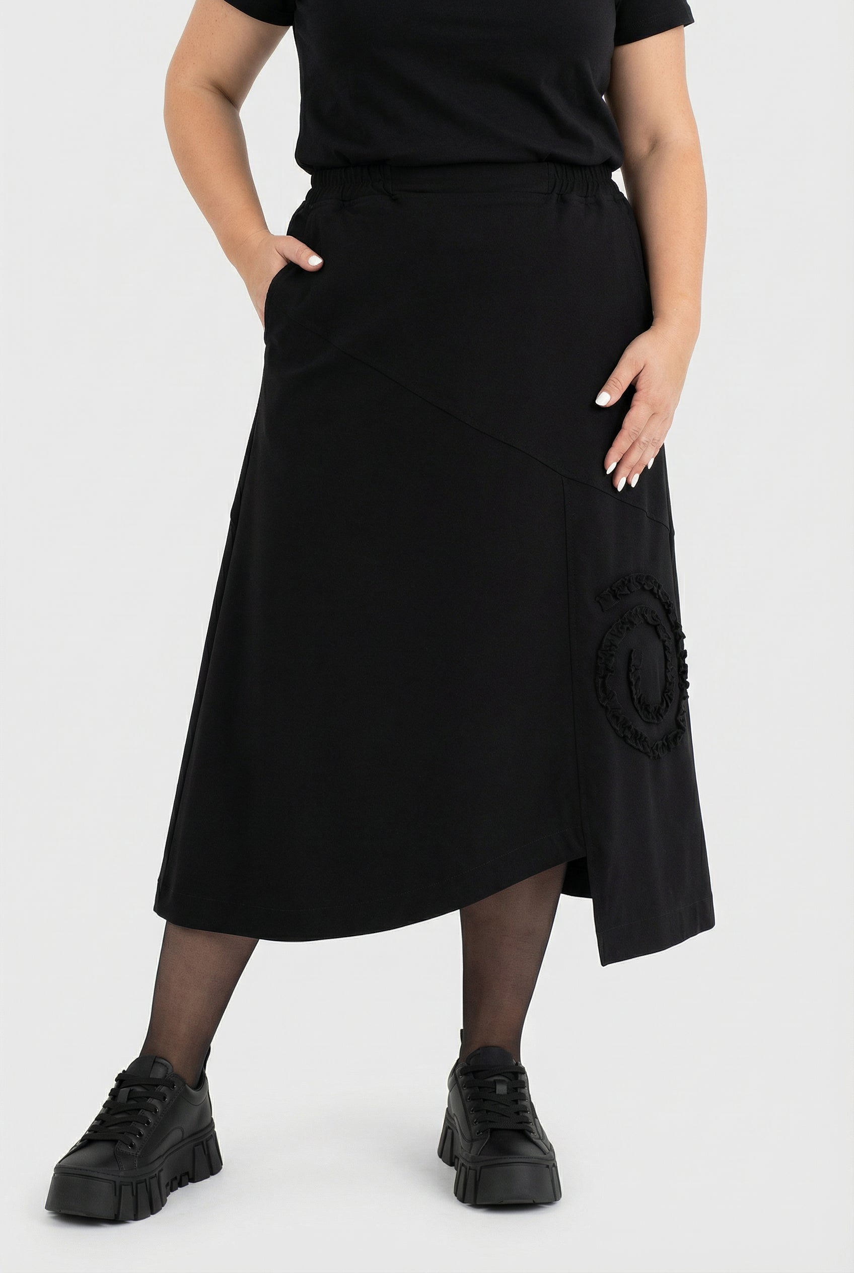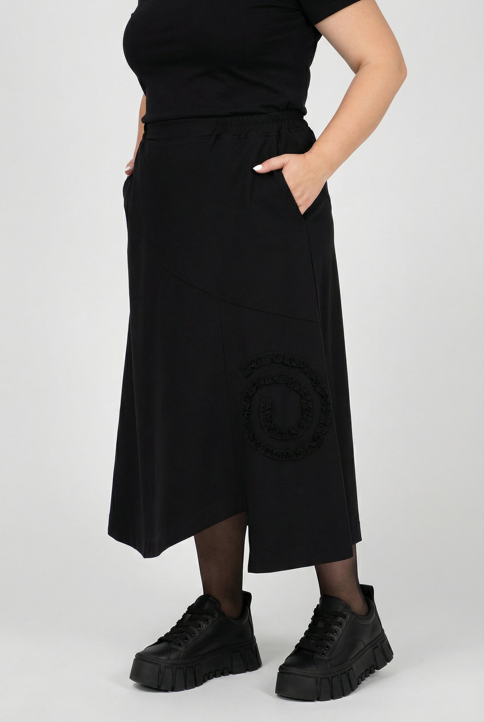 Detaljer: Diagonal delingssøm, asymmetrisk kant med lille slids, sidestiklommer, spiralformet flæse-applikation som tone-i-tone højdepunkt