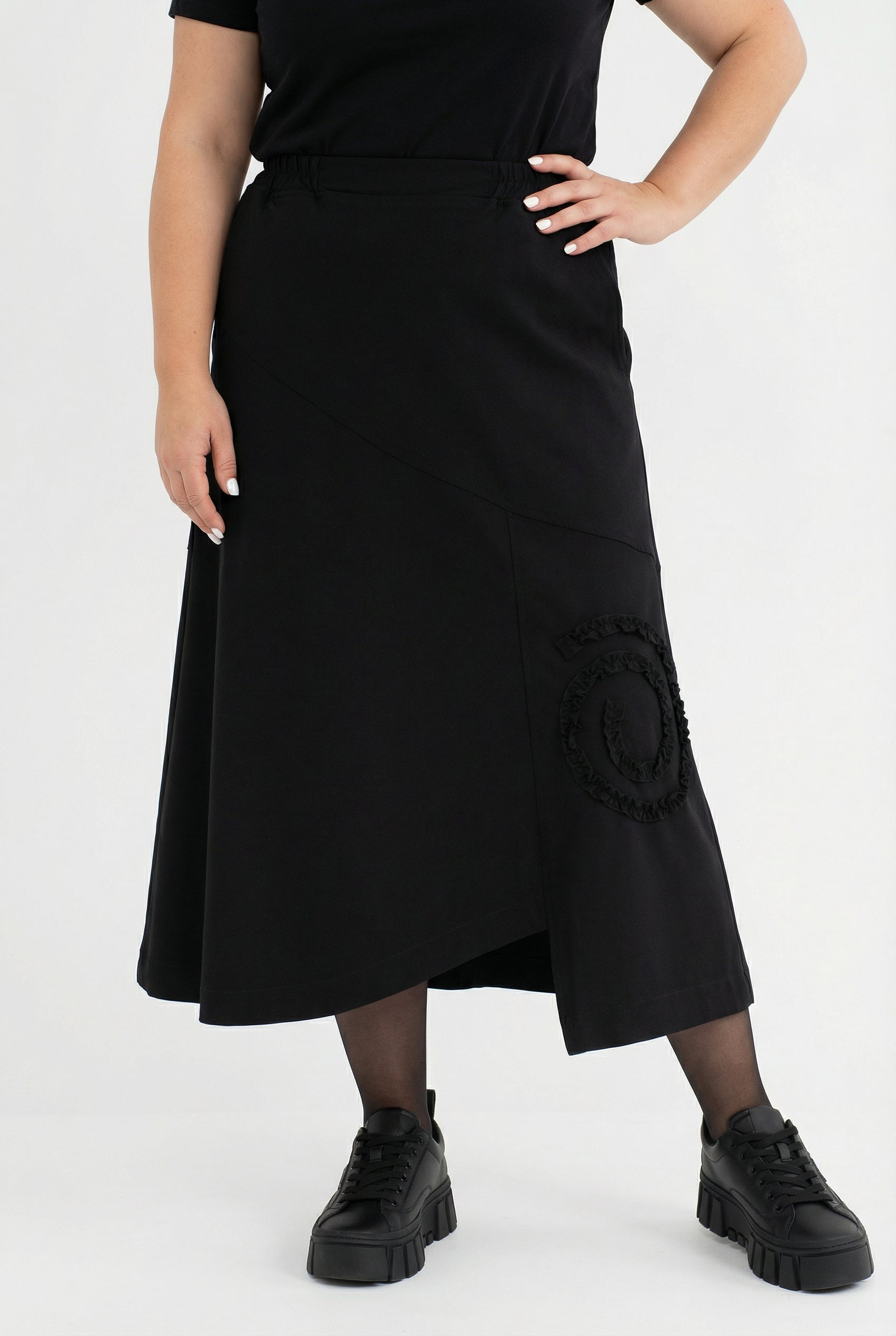 Der Rock für mühelosen Chic: weicher Viskose-Mix, Komfortbund und ein asymmetrischer Saum, der jeder Bewegung eine moderne Leichtigkeit gibt.